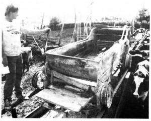 "We built it 22 years ago for $500 and it still works great," says Klug, who built the feeder with the help of Ezra Schauer. He who uses it to feed a mixture of silage and grain to 70 Holstein feeders. "We had been pushing silage down the feed bunk with shovels and garden carts which was a half hour job. We looked at automated bunk feeders but they cost too much. Also, our feed bunk is out in the open where feeder mechanisms could freeze up and we didn't want to have to spend a lot of time repairing it.