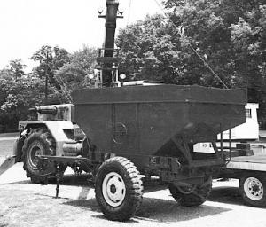 High school students taking part in an educational job training program in Benton, Ill., discovered an unusual way to make use of military equipment. They mounted a used 175-bu. gravity wagon onto a 2 1/2-ton military trailer equipped with tall 11.00 by 20, double grooved tires.