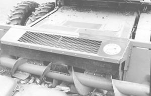 Distel Grain Systems' "Corn Saver" attachment bolts to the head above the cross auger. It has a rubber skirt on bottom to keep cobs in. It has an expanded metal top panel that acts as a window so you can see what's going on. It's hinged so it folds back on top of the feeder house so you can clean and service the auger easily.