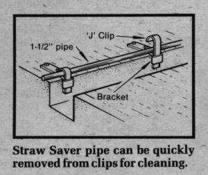 The Straw Saver helps hold bedding in stalls so cows don't lie on the wet floor and get infected udders. The Straw Saver also provides a toe-hold for cows with bad legs to get up. It consists of brackets that fasten to the cement floor. J-clips fit into the brackets and hold a 1¢-in. dia. pipe in place. The pipe rests ¢-in. above the floor just at the edge of the gutter and the stall, leaving enough room so urine can run out underneath. The J-clips make it easy to remove the pipes in summer.