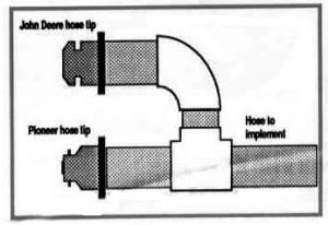 I came up with a double hydraulic hose tip that I often put on used equipment to make it easy to use tractors with different hydrautics without having to use adaptors. It's very easy to install by simply replacing the present tip with the nipples, elbow and tee as shown in the attached drawing. (Dan Goedken, Rt. 1, Box 115, New Vienna, Iowa)