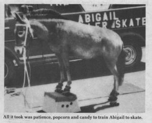 "All it took was a little patience and some sugar lumps, candy, and popcorn. I started training her in September and, 7 months later, she was skating pretty well. She's a real sharp mule. She can turn, stand on a stool and now I'm teaching her to bow. To stop, she skates on to a mat.