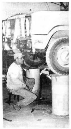 The 14-in. wide, 3/8-in. reinforced sheet metal ramps which bridge between the wall and the pedestals are adjustable to the different widths between wheels of each individual vehicle. They are also removable for ease in working under vehicles.