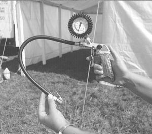 A long flex hose clips to the valve stem. A pressure relief knob on the handle is used to let air out. Tire pressure is shown on a gauge mounted at the top of the handle. The pressure reading is provided as soon as you hook the hose onto the valve stem and also whenever you let go of the trigger.