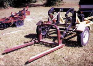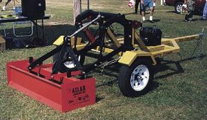 The 2-wheeled trailer hooks up to any standard 2-in. dia. ball. The 3-pt. hitch is operated by a single 3 by 8-in. hydraulic cylinder rated at 2,500 lbs. A 12-volt deep cycle battery operates a hydraulic pump which is supplied by a 2 1/2-gal. hydraulic reservoir. The 3-pt. is activated by a remote toggle switch in the cab.