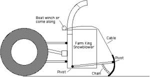 A boat winch mounted on top of the snowblower raises the blade for backing up.