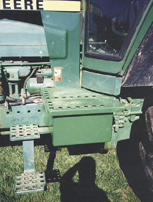 We attached the battery box to the existing entry side battery box and modified the cover. This provides an additional 7 1/2 in. of width to the entry platform space, making entry to the cab much easier and safer. The new-style hand rail steps can be attached to this setup. This bolt-on conversion can be done in the average farm shop and requires patching the holes where the muffler and air intake stack were located.
