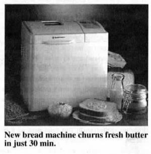 First-of-its-kind bread machine not only makes fresh breads from scratch and bakes them, it also chums fresh butter from heavy cream.The Toastmaster 1195 has a 30-minute churning cycle. You just pour in the cream and turn it on and it does the rest.
