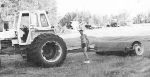 The roller consists of a 12-ft. long, 1/2-in. thick piece of water main pipe that had never been used. He bought a 4 by 8-ft., 3/8-in. thick sheet of steel and cut out circles to make the end plates. He removed the axle hubs from an old IH 150 combine and drilled holes in both end plates so that he could bolt on the hubs. He welded the bolts in the end plates to waterproof them. Next he used lengths of 3-in. wide, 3/8-in. thick flat bar to make six spokes that weld to the inside of each end plate. He then welded the end plates and hubs to the main pipe. He bolted the wheel rims back onto the hubs, built a steel frame, and welded it to the rims and then jointed them together. The hitch off a 24-ft. Morris rod weeder was then welded to the frame.