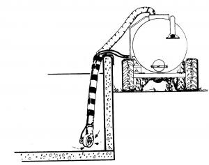 To fill a liquid manure tank, you simply drop the pump down into a pit where needed and hook the hoses up to tractor hydraulics. What farmers like about the portable unit is that it's easy to carry from pit to pit and the hydraulic pump has plenty of power to compare favorably with stationary or wheeled pumps. And when you're done hauling manure, it can also be used to pump water. For example, maybe you're digging a ditch and it fills up overnight with water. You just drop the pump down into the hole and pump it out.