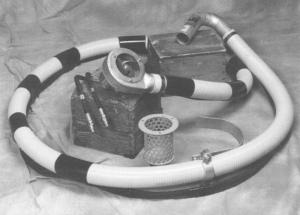 The portable unit consists of a hydraulic-driven pump mounted at the end of a flexible length of plastic tubing. Hydraulic hoses tie to the tubing.
