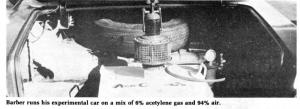 Lee Barber, a Massachusetts welder for 30 years, has converted an old car to run on carbide gas from a generator he placed in the trunk. Special precautions were taken to keep water from splashing into the carbide which could cause uncontrolled production of excess gas. An antibackfire valve was also added to prevent a..........
