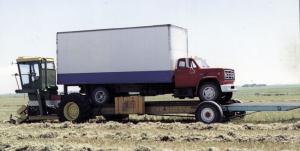 The Vauxhall, Alberta, farmer-inventor carries a 3-ton truck on the back of his Deere 5400 harvester. When the truck gets full, he drives it off the 22-ft. deck and heads back to the farm.