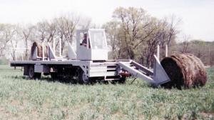 The bale hauler is equipped with a cab on front of the deck and an 11-ft. bale loading arm. Both the cab and bale arm slide back and forth from one side of the deck to the other, swapping places as needed to load bales.