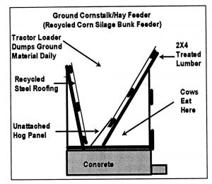 "I use a loader bucket to dump feed over the 4-ft. high side of the bunk. First I dump in ground ear corn. After the cows have eaten that I dump in a mixture of ground corn stalks and ground hay. The bucket is 8 ft. wide and the bunk's support posts are spaced 10 ft. apart so I always know exactly where to make each dump."