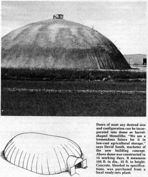"Farmers can use it to store almost anything at a third to half the cost of conventional farm buildings," says David South, president of South's, Inc., an Idaho-based company which has introduced concrete Monolith domes, a new concept in low-cost farm building construction.