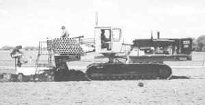 The self-propelled Wolfe Drainage Plow lays concrete tile in place as the plow raises the soil. No backfilling is necessary. The machine requires several people to operate. One works the controls. Two keep the 8-ft. long boot filled with sections of concrete tile. The boot itself is wide enough that one worker can watch the tile drop into place and, at the same time, mark any areas that might not be laid correctly because of rocks, etc., for immediate repair.
