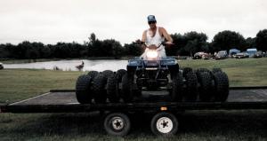 Gene Riddlestine's Polaris 250 is more than an "all terrain vehicle". He calls it an "all anywhere vehicle". When he adds 12 wheels to the four wheeler, there isn't much that can stop him, including lakes and ponds. The idea came to him when a former employer, a local Polaris dealer, asked him to help pull snowmobiles