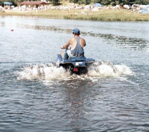 The first year, Riddlestine simply put spacer drums on each wheel and the 16-wheeler crawled across the lake at about 1/4 mph. The second year, he turned the ATV into a paddle wheeler by welding four steel paddles onto the spacer drums. This brought his water speed up to about one mph.