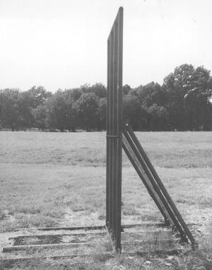 Sallee used 2-in. dia. used steel pipe to build the entire unit. It consists of four 10-ft. long vertical pipes mounted on a 9-ft. long base made from four horizontal pipes. The vertical pipes are supported by four brace pipes that bolt onto one end of the base and mid way up the vertical pipes. He welded pairs of metal tabs to the pipes at all contact points and also drilled holes through the pipes. By removing four bolts where the braces attach to the vertical pipes he can fold the entire unit flat for storage.