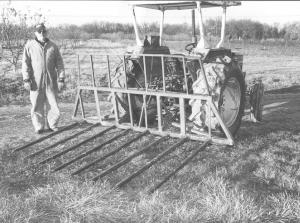 Bob Malham and his wife, Laverne, operate an orchard near Carlinville, Ill. They built this big rake to pick up branches pruned from fruit trees. The rake is 3-pt. mounted and has a hydraulic cylinder at the top. It's made out of tube steel with six 5-ft. fork tines. Malham windrows the pruned limbs and then..........