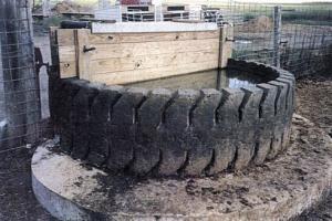 It has a hinged wood lid. The bottom of the tire is closed by screwing a 1/4-in. steel plate to the bead with lag screws and sealed with silicone caulk. A riser pipe is made from 12-in. dia. pipe with a 1/4-in. or heavier thickness. A 3/4-in. pipe coupling is set onto the riser pipe and welded into place. The incoming water line comes up inside the riser pipe and plumbs into the 3/4-in. pipe coupling. I also drill a 2-in. cleanout drain hole on the bottom of the tire and place a drain plug into it for a stopper.