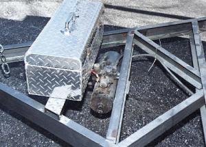 The chassis and box were built from scratch. The toolbox houses a 12-volt wet cell battery and charger. It is located just above a combination starter motor and hydraulic pump which serves to raise the bed into dump position. There is a button on the underside of the box which activates the motor.