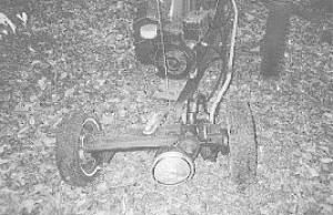 "Now I can tow the splitter to the woods with my pickup using a ball hitch, and then unhook the splitter and connect up the drive axle by hooking up the hydraulic lines and steering bar. Then I can drive wherever I want, walking alongside. It moves at about walking speed and is very maneuverable. If it's wet or slippery, I have a set of chains for the 12-in. snow tires on the drive wheels.