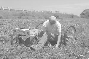 One of the results of this work has been the development of a seated cart for use in vegetable and strawberry field work. New parts for this cart would cost about $150, but you could also use scrap materials.