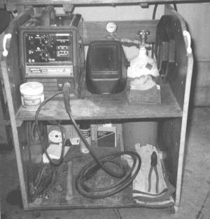 Old Computer Desk Turned Into Portable Storage Unit For Lincoln Wire Feed Welder WELDERS/TORCHES Welders/Torches 25-2-40 William Fazer, Powers, Mich.: "I salvaged an old computer desk to make this portable storage unit for my Lincoln wire feed welder. A hole cut near the back of the top shelf allows the CO2 tank to set on the lower shelf. The bottom of the tank is held in place by small strips of wood. Pegboard on the rear of the lower storage area holds spare tips, spools and small parts. To handle the extra weight, I replaced the plastic casters with steel wheels. I also added two small handles to the top of the unit to make it easy to roll the cart out from under the workbench."