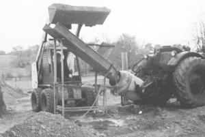 Dump Chute Feeds Cement Into Tractor-Mounted Cement Mixer