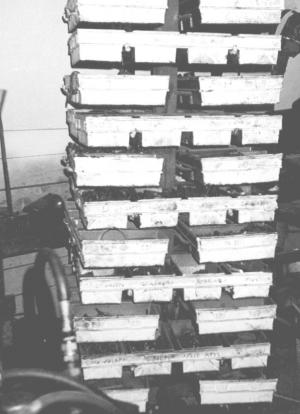 "The metal pans came connected together in trays, with four pans per tray. Each tray measures about 1 1/2 ft. wide by 3 ft. long. There's an opening between each pan. The Lazy Susan consists of a 7-ft. length of sq. tubing that rotates at the bottom on a front wheel spindle off an old tractor. The spindle mounts on a big truck wheel rim that serves as a base. To mount the trays, I welded a series of steel rods at right angles to the tubing to match the openings on the pans. The pans simply rest on top of these rods. There are 36 trays in all.