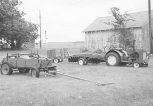 His first models were of old horse-drawn equipment he still had on the farm. These include a half scale single bottom sulky plow, disk harrow and manure spreader. All can be pulled by their ponies or donkeys.
