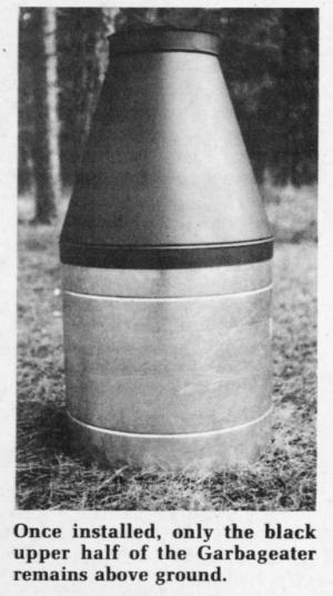 The Garbageater comes in two sizes, a 50 gal. model which "processes" enough garbage to take care of an average size home and a 160 gal. commercial unit. The 50 gal. model requires digging a 24 by 24-in. hole for the in-ground tube.