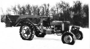 Key to success of the loader is that the car engine's transmission is coupled with the tractor's 5-speed, giving it 15 gears, including a 1/4 mph "creeper" gear and road gear of up to 26 mph.