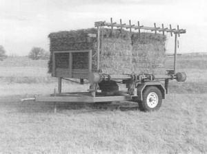 His "EZ Flake" holds two 4 by 8 big square bales and is powered by an electric motor that operates off the vehicle's 12-volt battery. The unit is equipped with two sets of conveyor chains, one for each bale. A front-end loader is used to load bales one at a time from the back of the trailer.