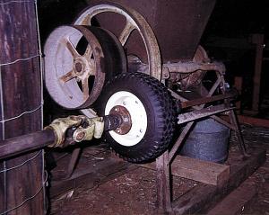 I attached a pto shaft to a small rubber tire and then attached the wheel to a shaft and mounted the shaft, with pillow block bearings on it, to the frame of the mill. The tire rolls against the pulley that the belt used to run on. I put just enough air pressure in the tire to keep it from slipping. I use my small IH 140 tractor to pto-drive the mill. It really works well. (Michael Young, 1920 Hurricane Church Rd., Clinton, S.C. 29325 ph 864 833-4461)