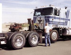 Here's a photo of a semi truck being hauled home with a "retriever" hitch that fits over the fifth wheel plate on another semi. I made the retriever to help a friend get his truck home. He's used it twice now, so it's saved him hundreds of dollars in towing fees.