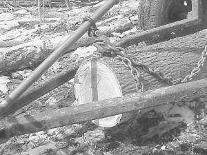 To use it, he positions the skidder over a log and wraps a chain around the end of it and hooks the chain to the hook on the slider bar. As he pulls forward, the hook slides up the bar, lifting the end of the log.