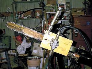 The Mount Juliet, Tennessee man salvaged the bar, chain, sprocket and one side cover from an old chain saw and mounted them on one side of a steel plate. He mounted a .45 cubic inch hydraulic motor onto the steel plate.