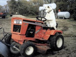 This photo shows my dog Brandy "driving" tractor. I guess it proves once and for all that farming is going to the dogs! Actually, Brandy isn't really driving the tractor - it just looks that way. Whenever I tell her to go drive the tractor, she jumps up onto the seat and then sits down and puts her paws on the steering wheel.