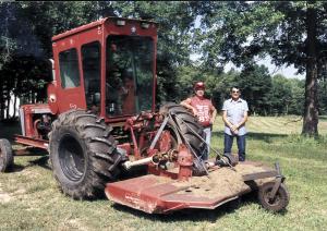 The unique mower was built out of parts from an IHC 403 combine and an Oliver 1850 tractor. A Bush Hog 10-ft. mower deck mounts on front.