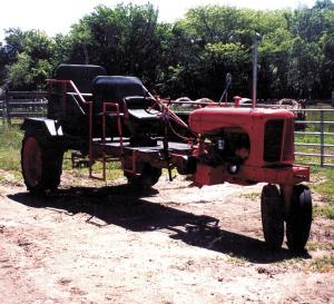 They welded together parts from two 1945 WC Allis Chalmers frames between the original tractor's front and rear ends, and put in a long drive shaft, with extra bracing for safety. It's "braced out to the cultivator bracket mounts to stabilize it." Cross members were welded on top of that, and they used a 4 by 8-ft. sheet of plywood for a deck. Seating is three-tiered, with two school bus bench seats and a very comfortable Farmall 460 seat for the driver. Each of the back two rows of seats are set eight to 10 inches higher than the seat in front of it.