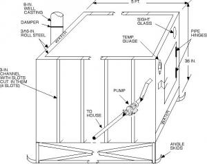 The wood burner measures 5 ft. long and 3 ft. high and mounts on angle iron skids. It sets about 100 ft. away from Tietz's house. It's made out of 3/16-in. thick hot rolled steel with a 3-in. wide water jacket built around it. A 1/4 hp electric pump sends heated water through plastic pipe to the house. The heated water is piped into a radiator, where a furnace blower propels hot air into the house. The entire system is thermostat-controlled.
