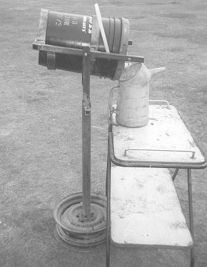 Pete Peters, Osler, Sask.: "I have come up with a stand that makes it easy to pour oil or other substances easily. It consists of an old wheel rim with a piece of steel pipe welded onto it. The strap iron bracket on top is made to hold a 5-gal. bucket. You can control the pouring with one hand, which leaves the other hand free to steady the container you're pouring into."