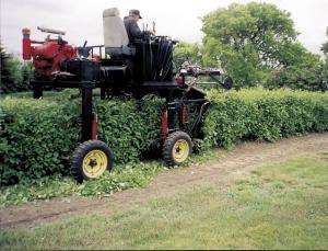 The hydraulic-operated, 2-WD machine straddles a hedge and is equipped with three sicklebar sections that let him trim the sides and top all in one pass. A 42-in. wide length of draper canvas off a Versatile swather delivers top trimmings to the side and onto the ground. The rig's four legs are each equipped with a hydraulic cylinder, allowing the entire machine to be raised or lowered up to 9 in. Another pair of cylinders can be used to independently raise or lower the sicklebars 9 in. If he's working on hillsides, he can hydraulically raise just one side of the machine, or just one side of the sicklebar unit.