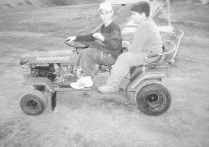 The "Togetherness" machine, as Rose calls it, is powered by an 11 hp Toro gas engine hooked up to a 3-speed transmission. Rose used the front of a Toro tractor and the back part of a Sears tractor, including the transmission. The hood and fenders came off a third machine. He cut the frame of the front tractor in half and welded in new material to lengthen it by 18 in. He also lengthened the drive chain. And he bolted on another seat on back, complete with metal tube armrests and a backrest.