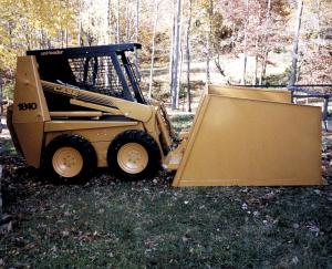 The quick-tach bucket is made from light gauge sheet metal and measures 8 ft. wide, 4 ft. high, and 5 ft. deep. He simply rakes or scoops leaves into the bucket, then dumps them out somewhere out of the way. Matthews primed and painted the metal so it won't rust.