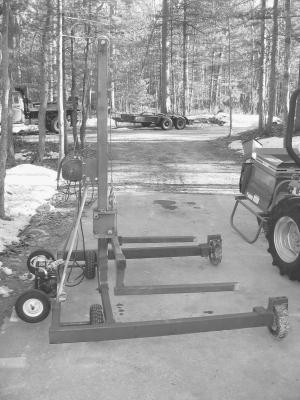 Pehovic also used the hoist to drill a 55-ft. well on his farm, installing a submersible system with a 4-in. pump. The hoist's lift arms were used to support a hydraulic auger drive that turned a 5-in. dia. drilling bit. "I used a shop-built swivel to hook up a water injection system to a 1-in. dia. drilling pipe. I was constantly going up and down with the drill to add and remove drill stems, so for this project I converted the hand winch to a 12-volt, battery-powered winch," notes Pehovic.