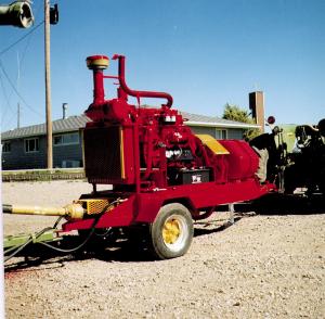The two-wheeled trailer is equipped with a Perkins 6-cyl. diesel engine, which belt-drives a 1,000 rpm pto shaft. The engine has about 200 hp and runs at 2,000 rpm's. A series of belts and pulleys are used to gear the pto down to operate at 1,000 rpm's. The controls and gauges mount next to the engine. There's a hitch both on front and back.